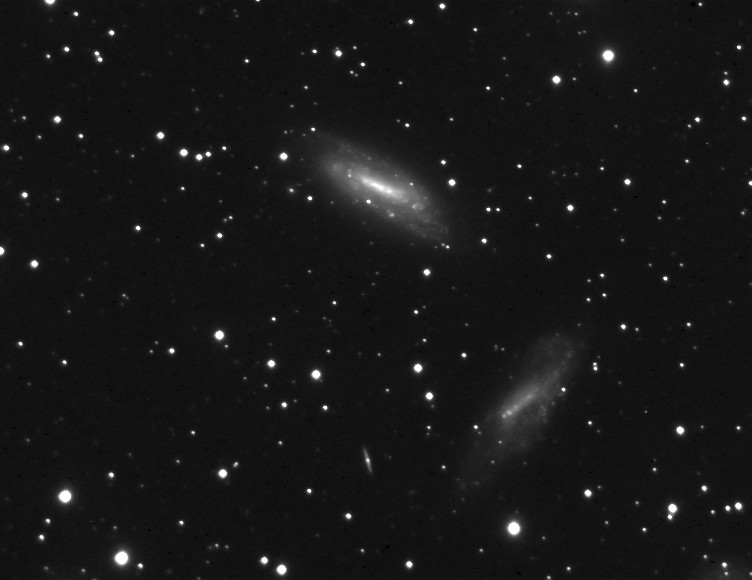 NGC 672 is the northern galaxy in a pair with IC 1727 in Triangulum. Guide 8.0 doesn't seem to have a name for the small edge-on galaxy near the bottom although it is quite bright.