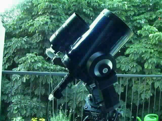 As the webcam is not very sensitive compared to my MX512 camera, I found it necessary to couple it to a freely movable guidescope. With the ability to easily move the guidescope it usually is possible to find a bright enough guide star even under my light polluted inner city skies. Under a dark sky a suitable star should be almost anywhere the scope points to unless it points to an area where very few stars are. Although I haven't done any quantative measurements of the webcam's sensitivity I usually find that it can guide on every star that is clearly visible in my 8x50 finderscope when coupled to my 90/500mm Maksutov guidescope. The Maksutov is equipped with a standard camera tripod adapter, so I simply put it on the piggyback bracket of my LX200. I didn't have any problems with the stability of this setup and it allows for simple horizontal movement. The focal length of the guidescope is not critical, one of the usual 80/400 mm shorttube scopes should be enough for modest focal lengths of the main scope as AstroArt gives subpixel accuracy during guiding.